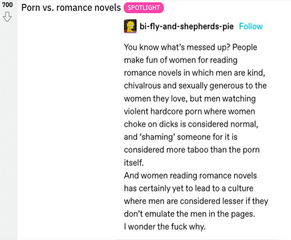 Fig. 20. Posted by u/MarineGoat. Written by bi-fly-and-shepherds-pie. “Porn vs. romance novels.” 27 May 2021, Reddit, www.reddit.com/r/PornHatesWomen/comments/nm4ul8/porn_vs_romance_novels/. Accessed 1 Apr. 2022.