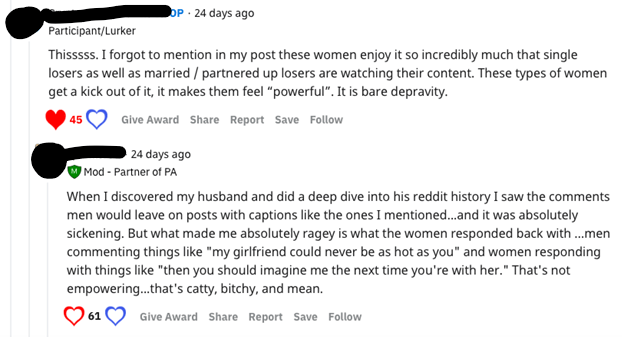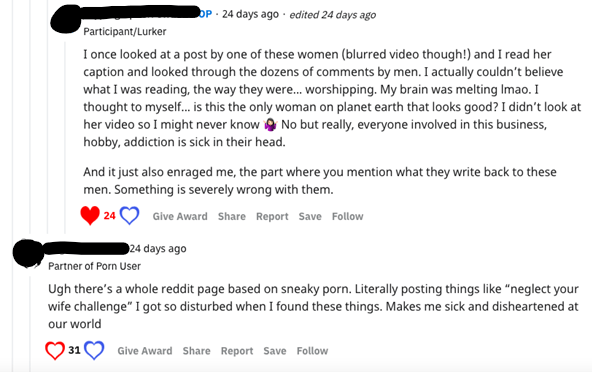 According to one reply(see fig. 18), women have to be the ones to adjust. They have to resort to avoidance strategies and comforting thoughts (“Do not check his Reddit”; “Remove the thinking…”) that only present band-aid solutions to the discomfort caused by their partners’ pornography consumption. Further, within these women’s responses is an undertone of one-upmanship: who is more “secure” and able to make their partners happy by condoning pornography use, thereby lessening any conflict in the relationship and keeping it artificially happy (see fig. 17), normative statements that, unintentionally or not, pressure women to ignore their very real and visceral reactions against sexual infidelity, and the subsequent gaslighting or denial of their emotions, both by the porn addict/user, and the myriad of women who continue to perpetuate the idea that they are happy to oblige by allowing their partners to consume a superstimuli that is neither conducive to real intimacy, nor emotional and spiritual safety within the relationship (perhaps, because some of them do not experience as much anguish due to their privilege in their individual relative relational security—what some call “maturity”). Privacy rights become a concern because behaviors that threaten the relationship’s integrity do not warrant transparency with each other.