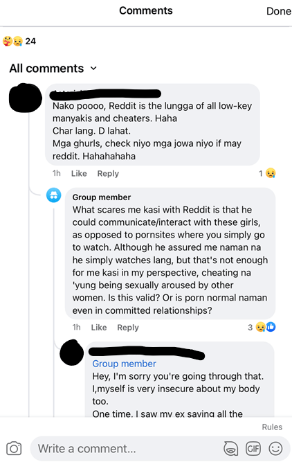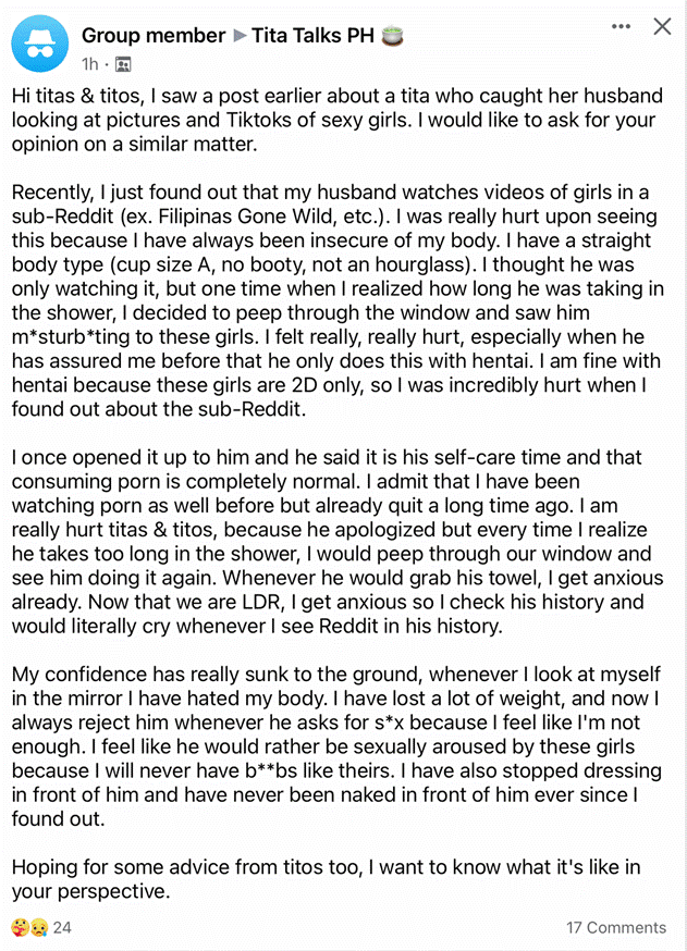It was in 2022 when I joined a Facebook group, Tita Talks PH, comprised of Filipino women and some men who participate in discussions about all kinds of topics, ranging from family, to work, to personal lives and their specific life situations for which they ask for advice, opinions, and suggestions. What precipitated this study found its catalyst in immediate, local stories situated in my own country, where I found that almost everyone has only anecdotal knowledge to go on regarding their stories about partners who consume porn, break boundaries, and commit infidelity.