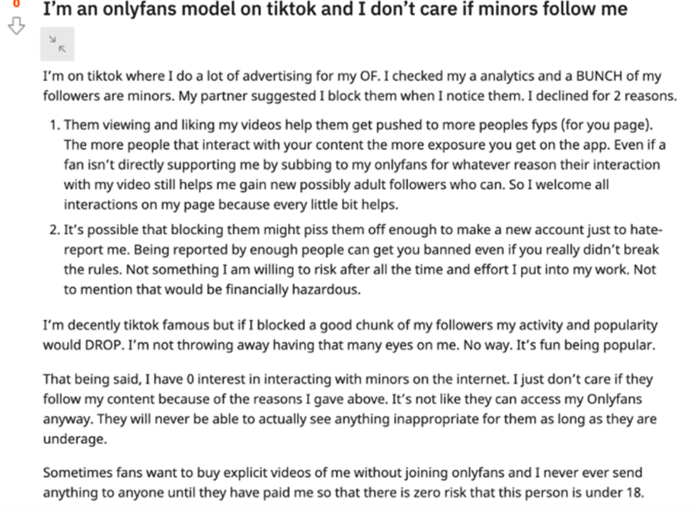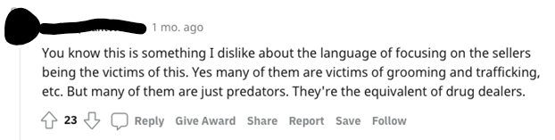 Meanwhile, the pornographic menu grows exponentially away from reality. Deepfake porn videos of your favorite actress who has not consented to her face being transplanted onto pornstars’ bodies to mimic an uncanny likeness. TikTok “thirst traps” of women vying for likes by dancing like strippers, taking advantage of filters, lighting, angles, and their audience’s eager, communally sanctioned readiness, on an app that supposedly prohibits sexual content. Actual strippers on TikTok advertising their OnlyFans, “getting the bag,” and actually thinking that exposing themselves to minors is okay because it helps their exposure. Women who post nudes for attention and who get a kick out of telling men they interact with to ignore their wives and think of them instead. Deviant avenues like subreddits where women encourage men to participate in “neglect your wife” challenges. Feminist critics who support sex work by spreading pseudo-empathetic messages and misinformation that criticize bills that seek to put controls in place to prevent exploitation and trafficking, the dissemination of child porn and revenge porn, and abuse of porn sites (Valens qtd. in Cox), that these identity verification requirements, measures required by the bill for adult performers on various websites, “do not solve online sexual exploitation,” as if its flaws cancel out all the good it would contribute toward ending sexual exploitation, as if online sexual exploitation is not effectively inherent in the nature of their “work” that promotes addiction to a product that is often produced under the influence of drugs, coercion, duress, and desperation. It would not be unreasonable to see pornography as a drug, and its manufacturers, drug peddlers, predators who prey on human weakness and libido for profit. A drug that predictably lobbies for itself and its ability for virulence and widespread acceptance.