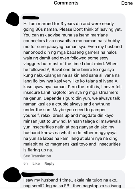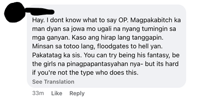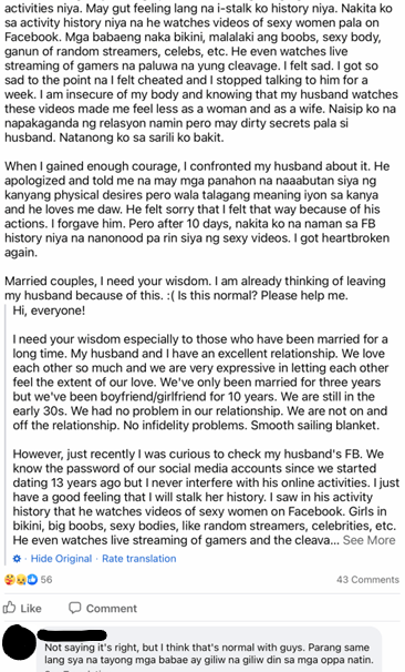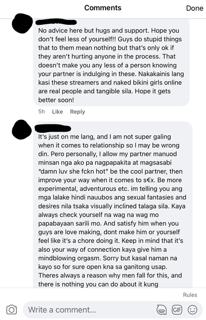 To start, why do women not question why it makes them uncomfortable in the first place, and if they do, why do they end up capitulating to comments that affirm that they are insecure or that they need to accept their partner’s habits? Where is the voice of reason who can give them enough insight into their partner’s eye-wandering and compulsive pornography viewing? The question, “Bakit ang bibilis ng mga lalaki bumigay sa tukso” or “Why are guys so easily and readily tempted?” only shows up in a non-porn infidelity post (fig. 10). Conversely, the temptation to cheat on their partners with porn is rarely confronted as a temptation itself, as if its entrenched pervasiveness is not something egregious due to its virtual medium. Hence, porn is not considered cheating because it is not tactile. It is no longer a temptation to do something potentially vastly hurtful to one’s partner, but a “coffee break” (Castleman).