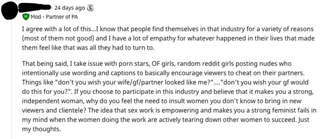 In a response to a Reddit post (Anonymous Poster 1) that calls for the accountability of women or sex workers who go into porn, user Anonymous Poster 2, a moderator of the Love After Porn subreddit and “Partner of a PA” (porn addict) outlines this encouragement of evil immorality, a powerful enemy hiding behind the shield of protection of fourth wave feminism, or, at the risk of oversimplification, the “girl boss” female empowerment brand of feminism that seeks profit at all costs.